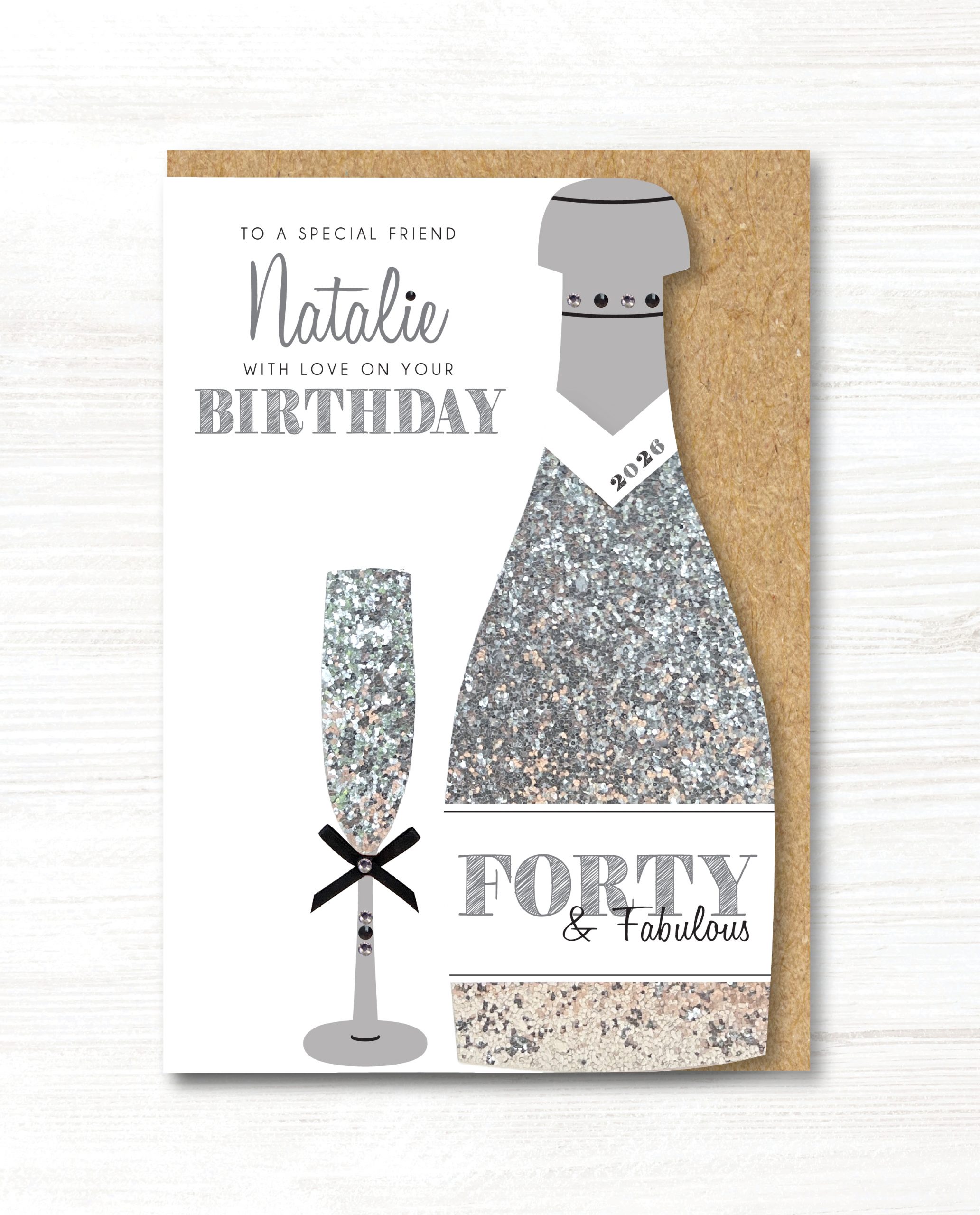 On the bottle is AGE & FABULOUS and CURRENT YEAR, with lovely matching jewels.