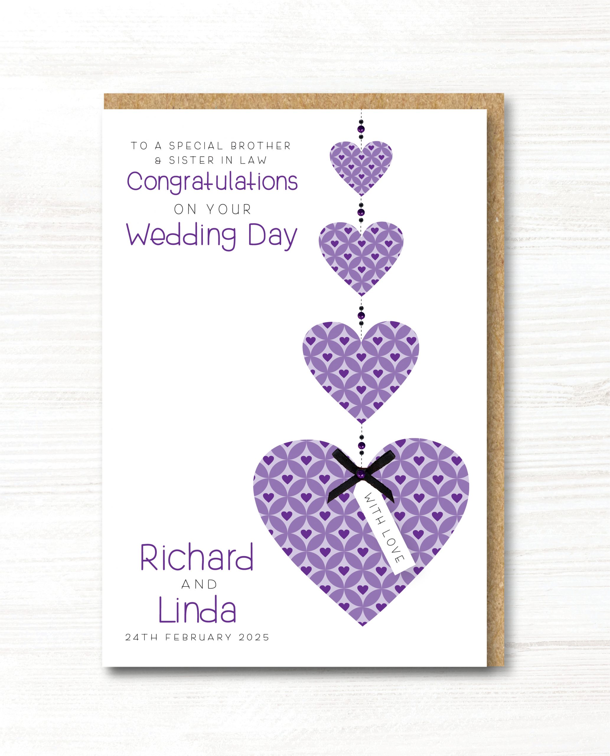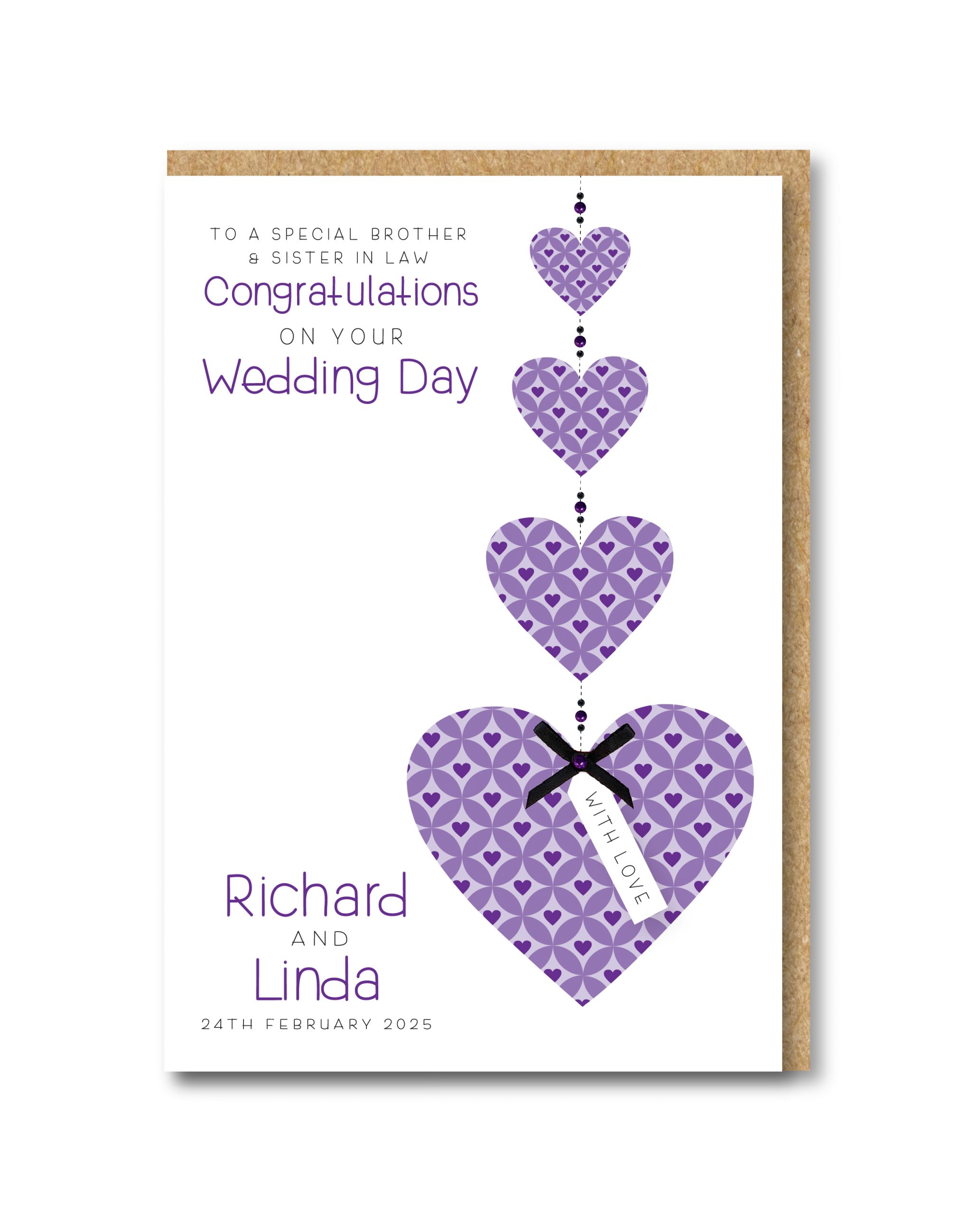 Gorgeous Wedding Day card with 4 purple patterned hearts hanging from the top,