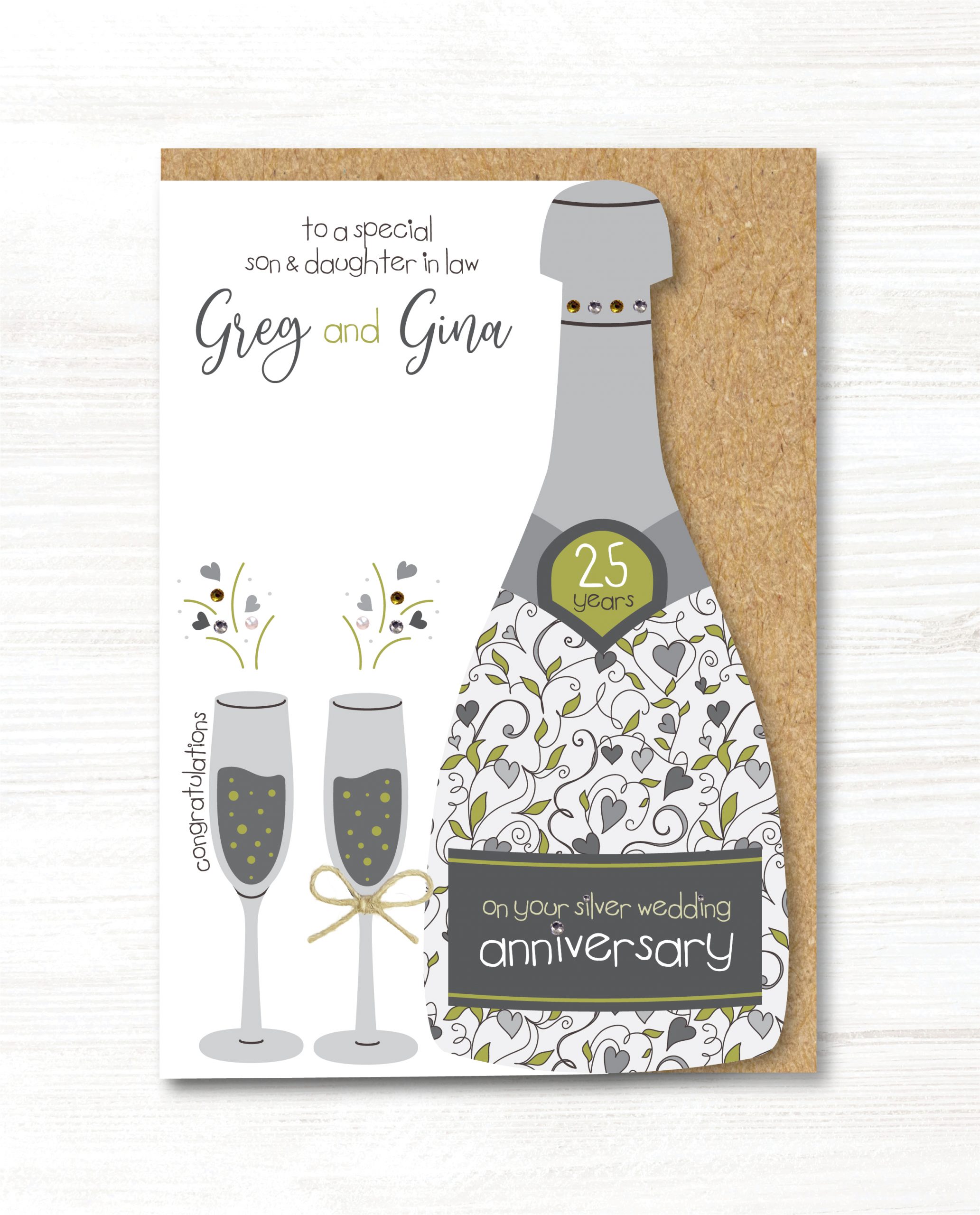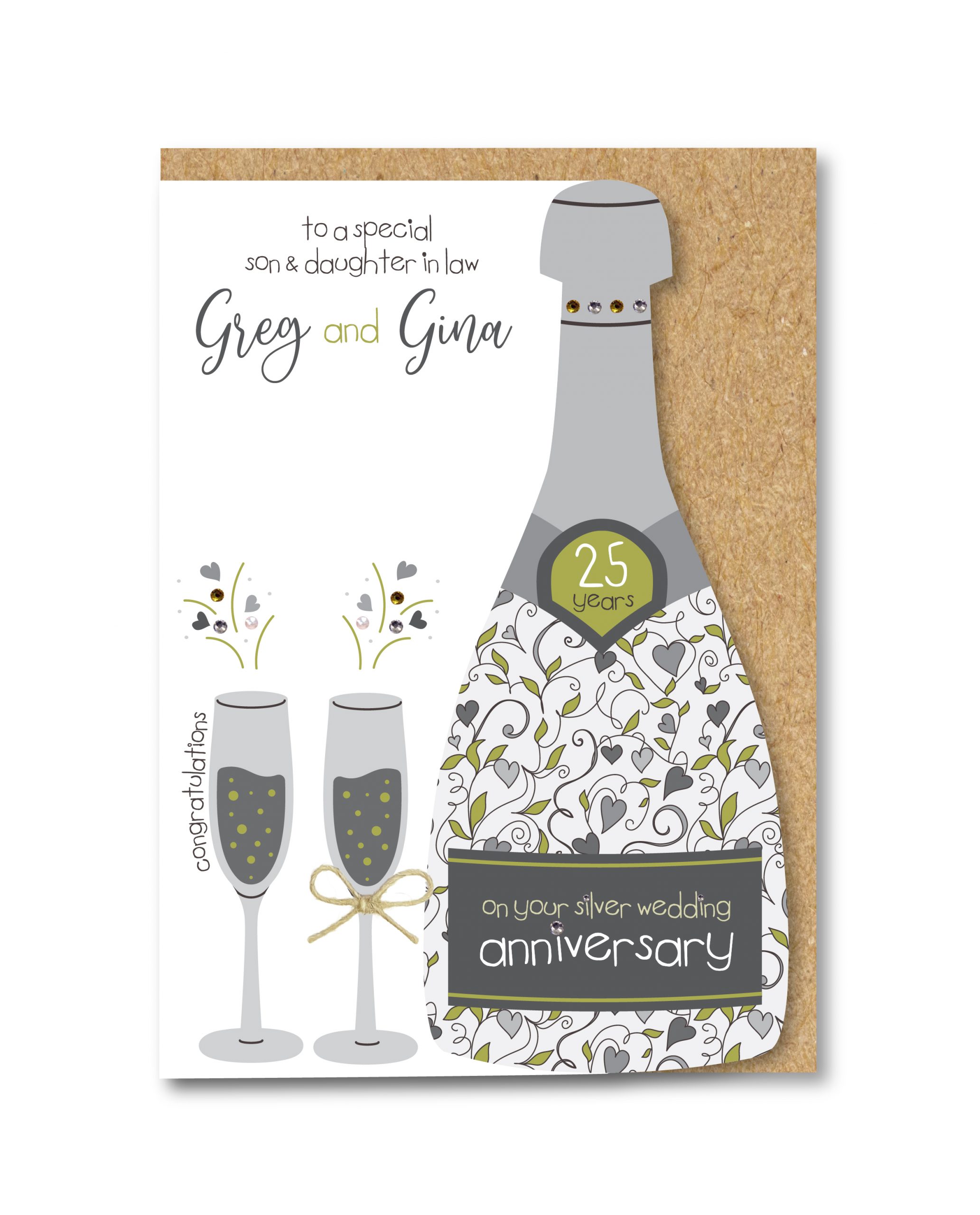 and CONGRATULATIONS around the glass and ON YOUR SILVER WEDDING ANNIVERSARY on the label, with matching jewels.