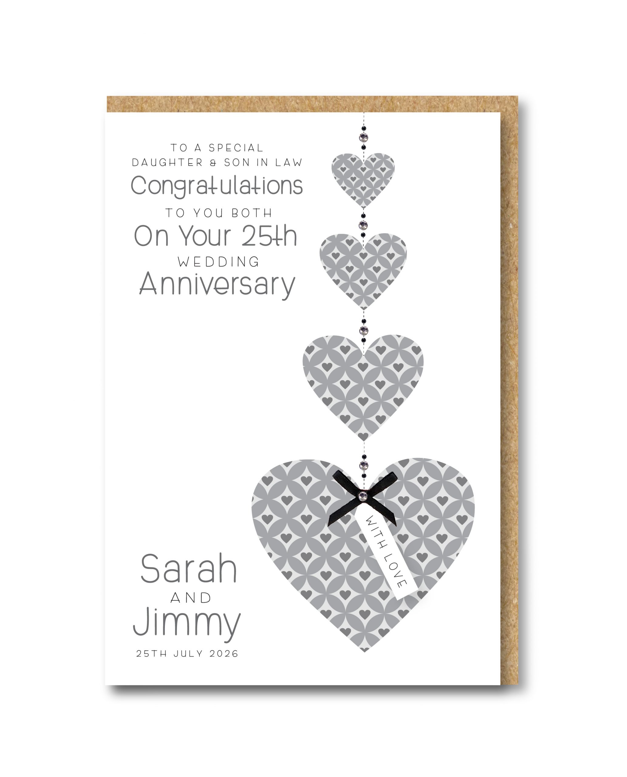 Gorgeous 25th Wedding Anniversary card with 3 silver grey patterned hearts hanging from the top,