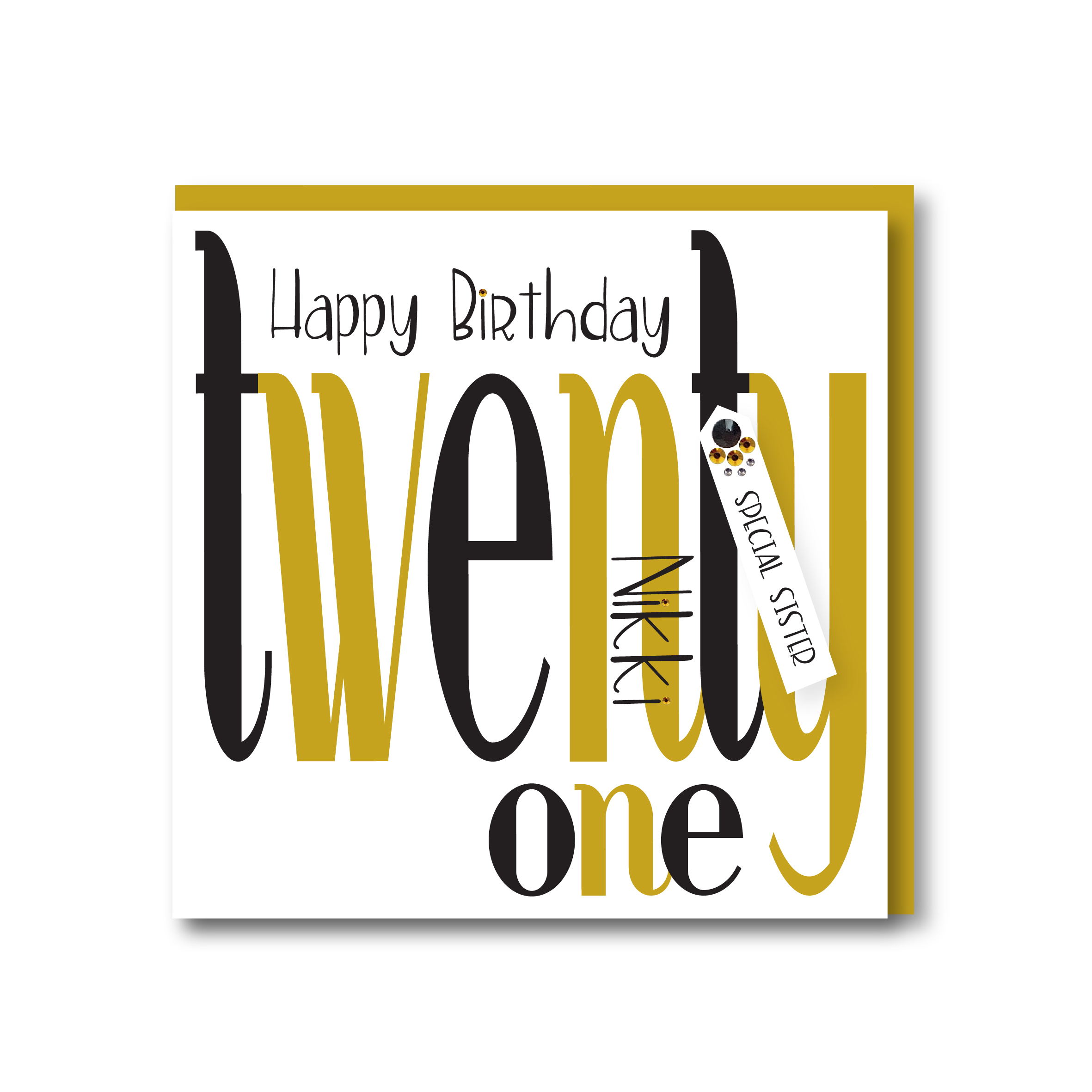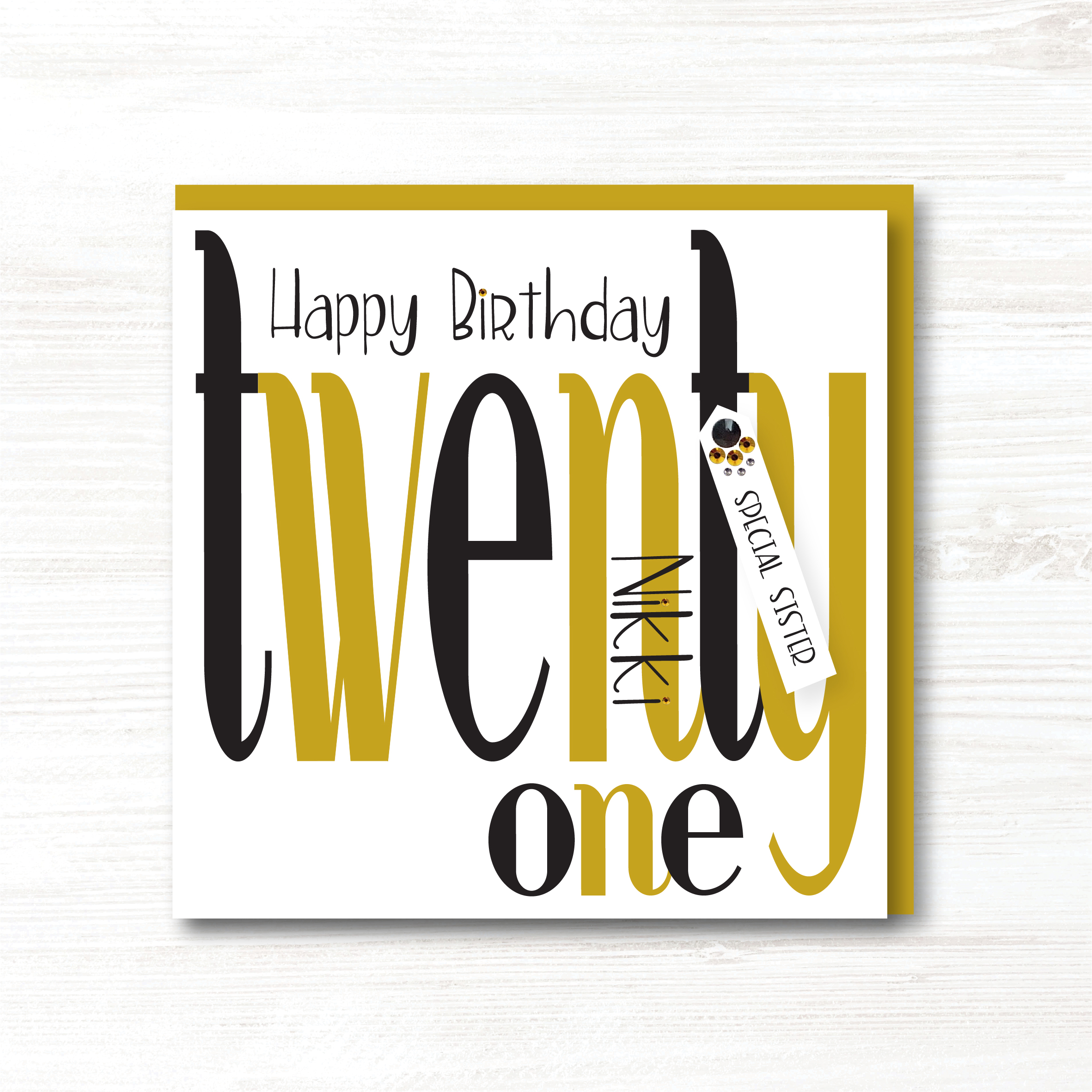 Lovely TWENTY ONE in large letters across the front in black and blue type,