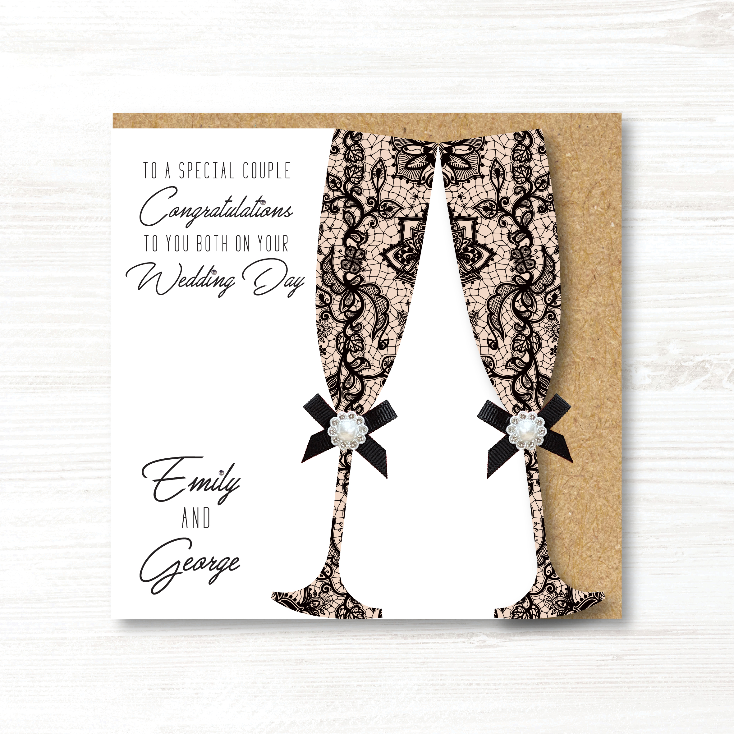 Card Description: Beautiful Champagne glasses with a lovely black and cream lace pattern cut out to the right side,