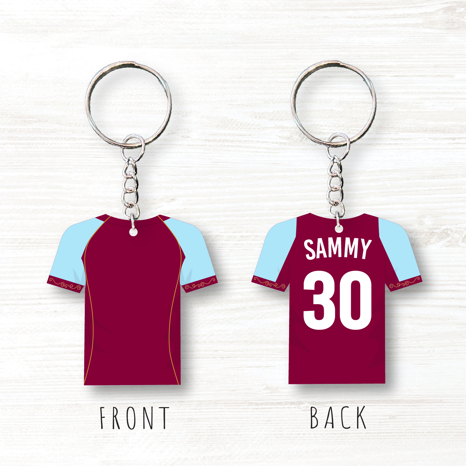The Keyring is in the shape of a football shirt.
