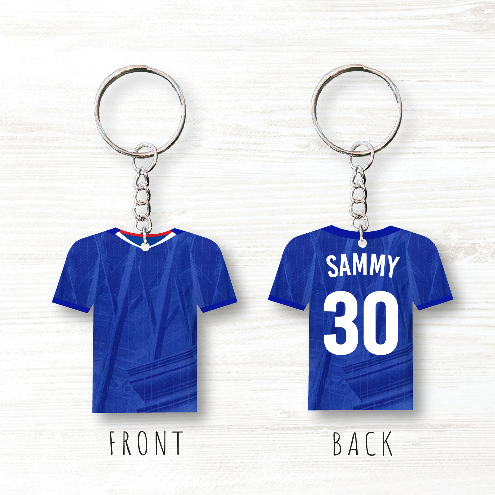 The Keyring is in the shape of a football shirt.