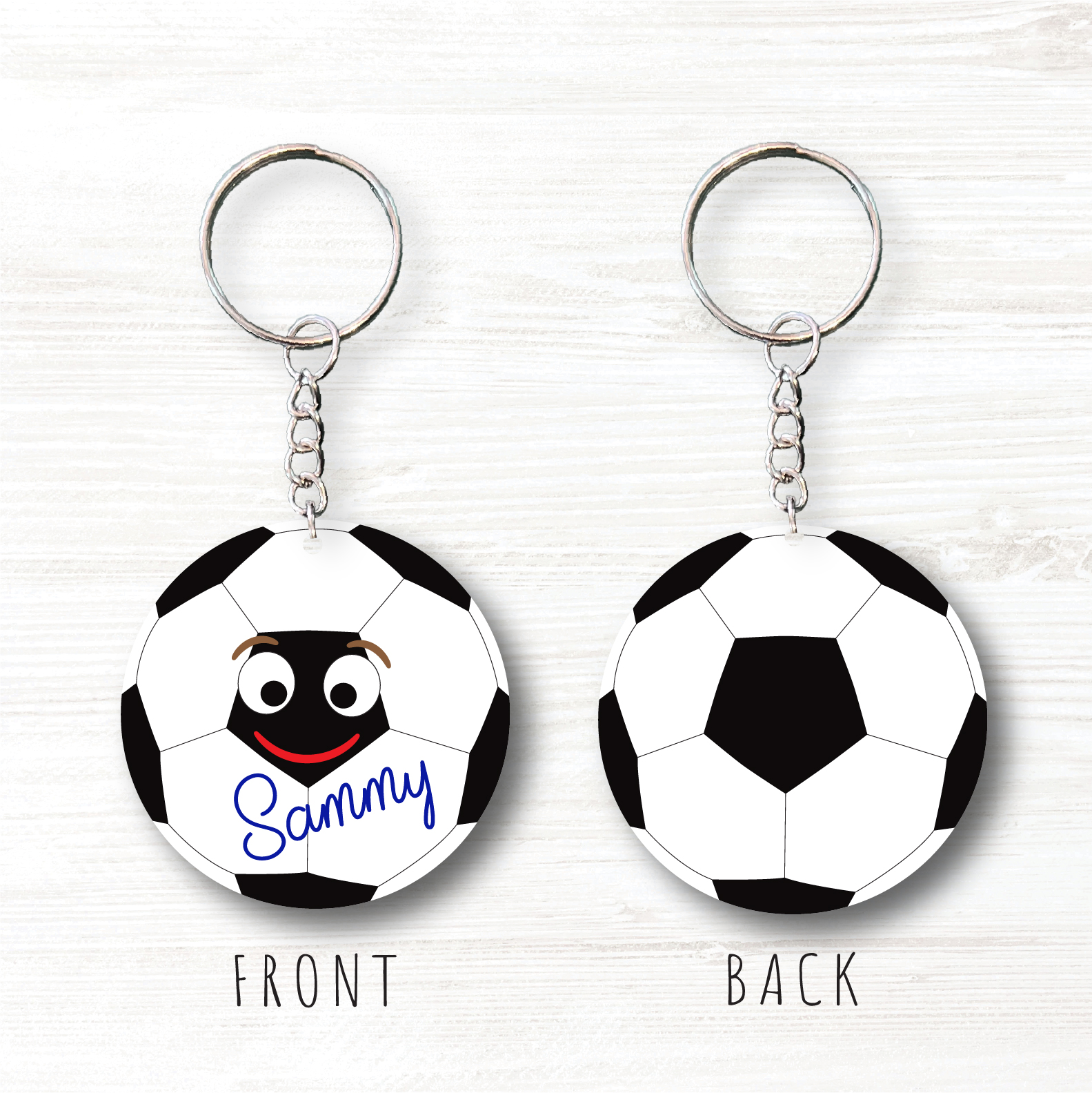 The Keyring is in the shape of a football, with a face on the front.