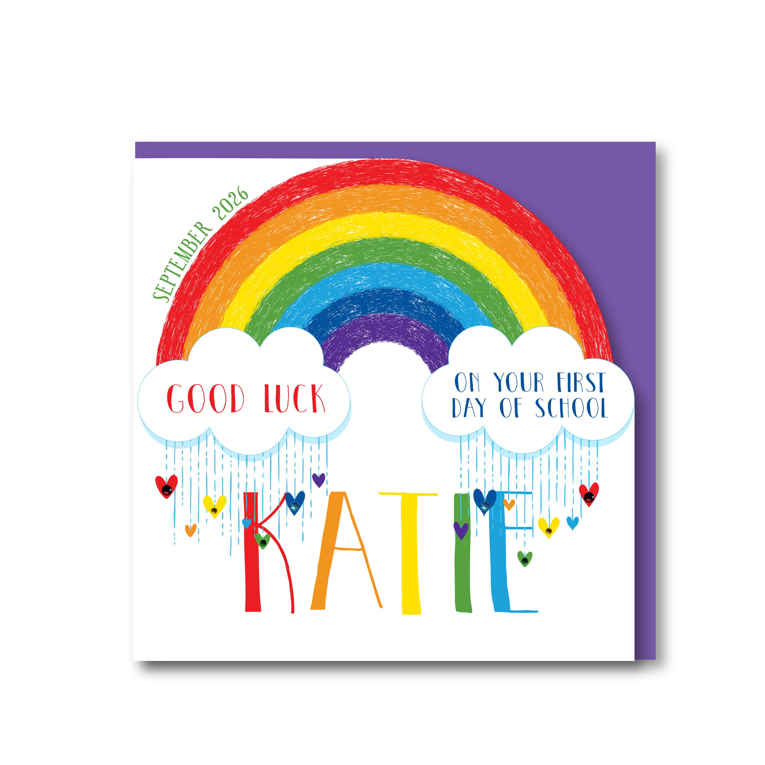 above the name is a beautiful Rainbow cut out from the right side, with clouds at the bottom.