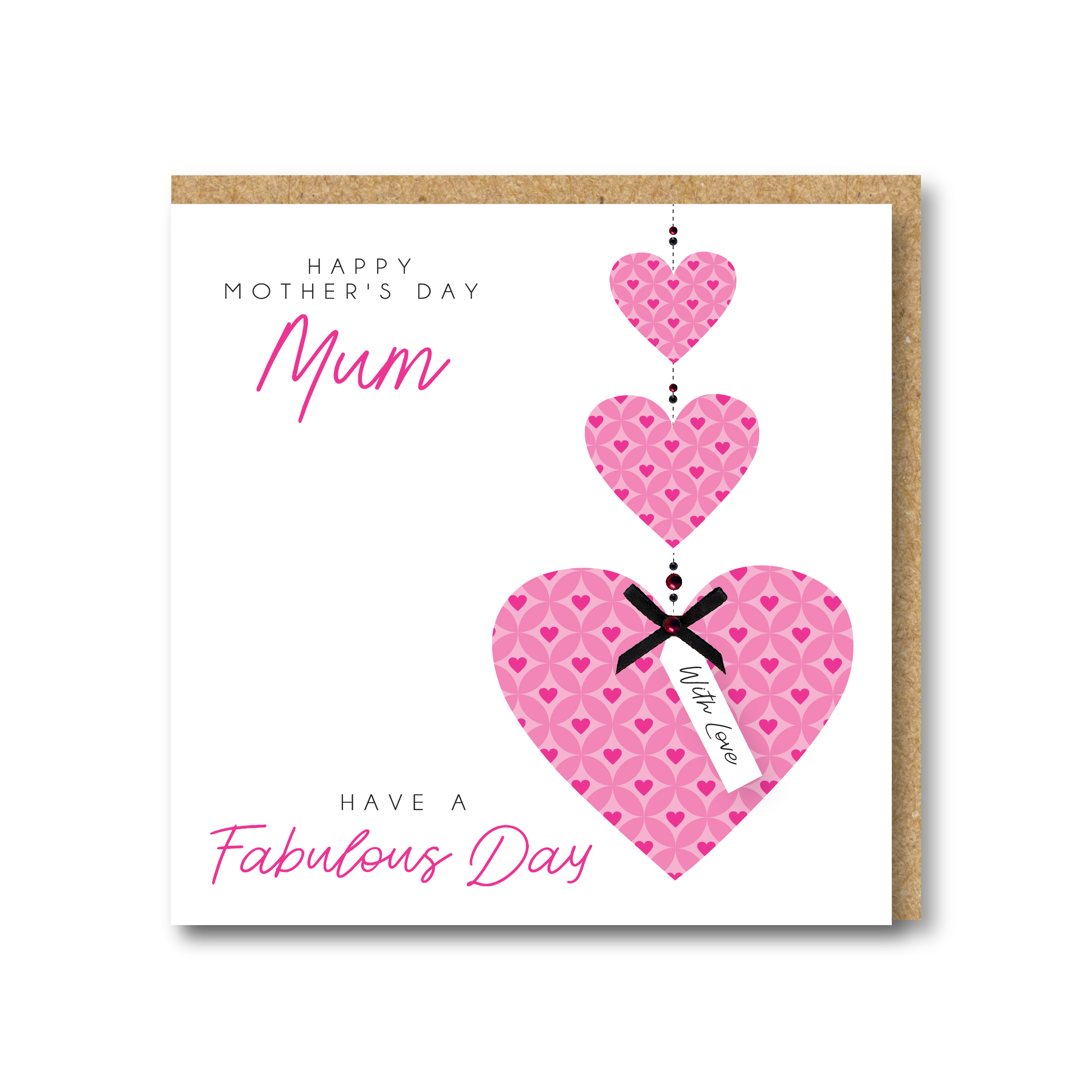 Card description: Gorgeous Mother’s day card with 3 pink patterned hearts hanging from the top,