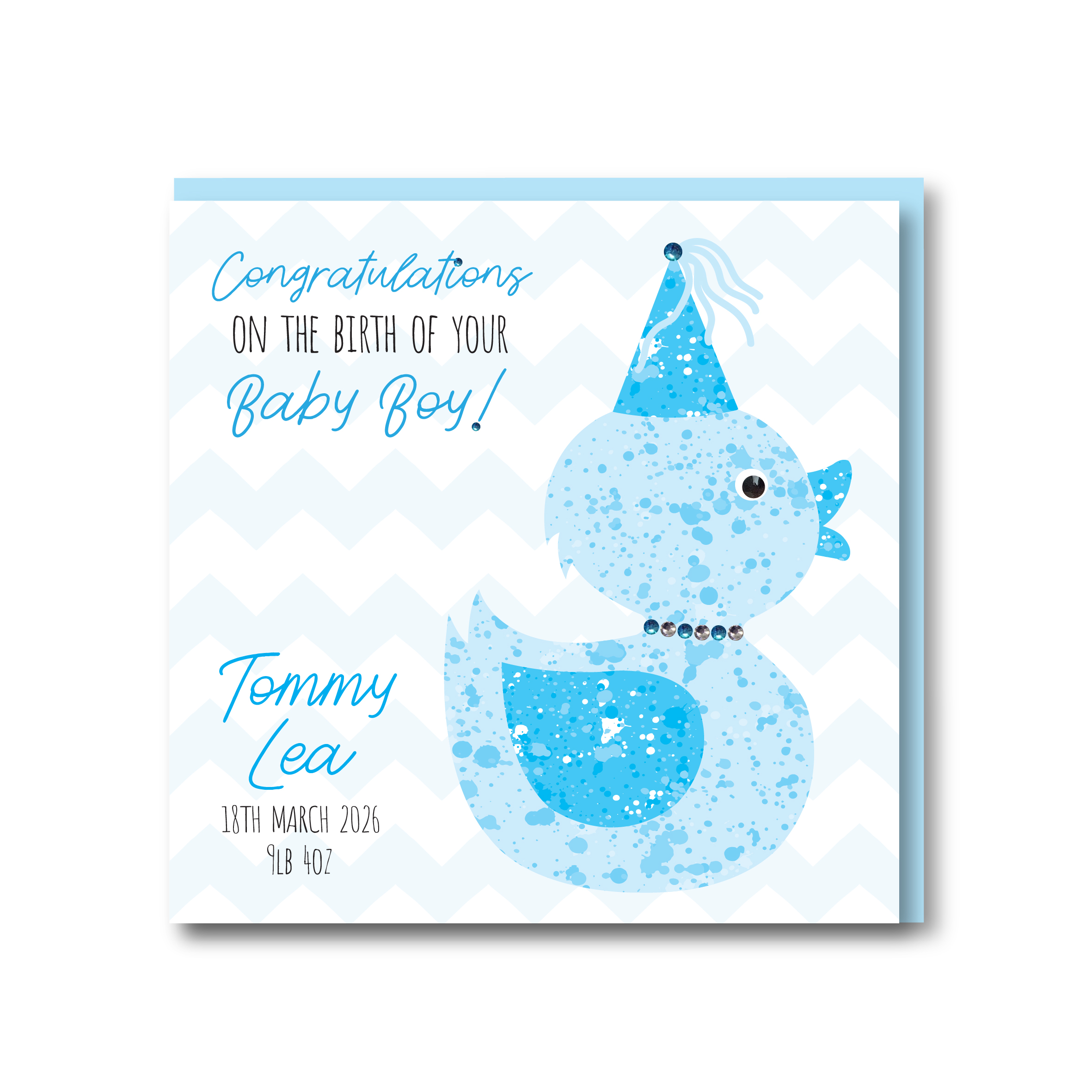 In the top corner is CONGRATULATIONS ON THE BIRTH OF YOUR BABY BOY!