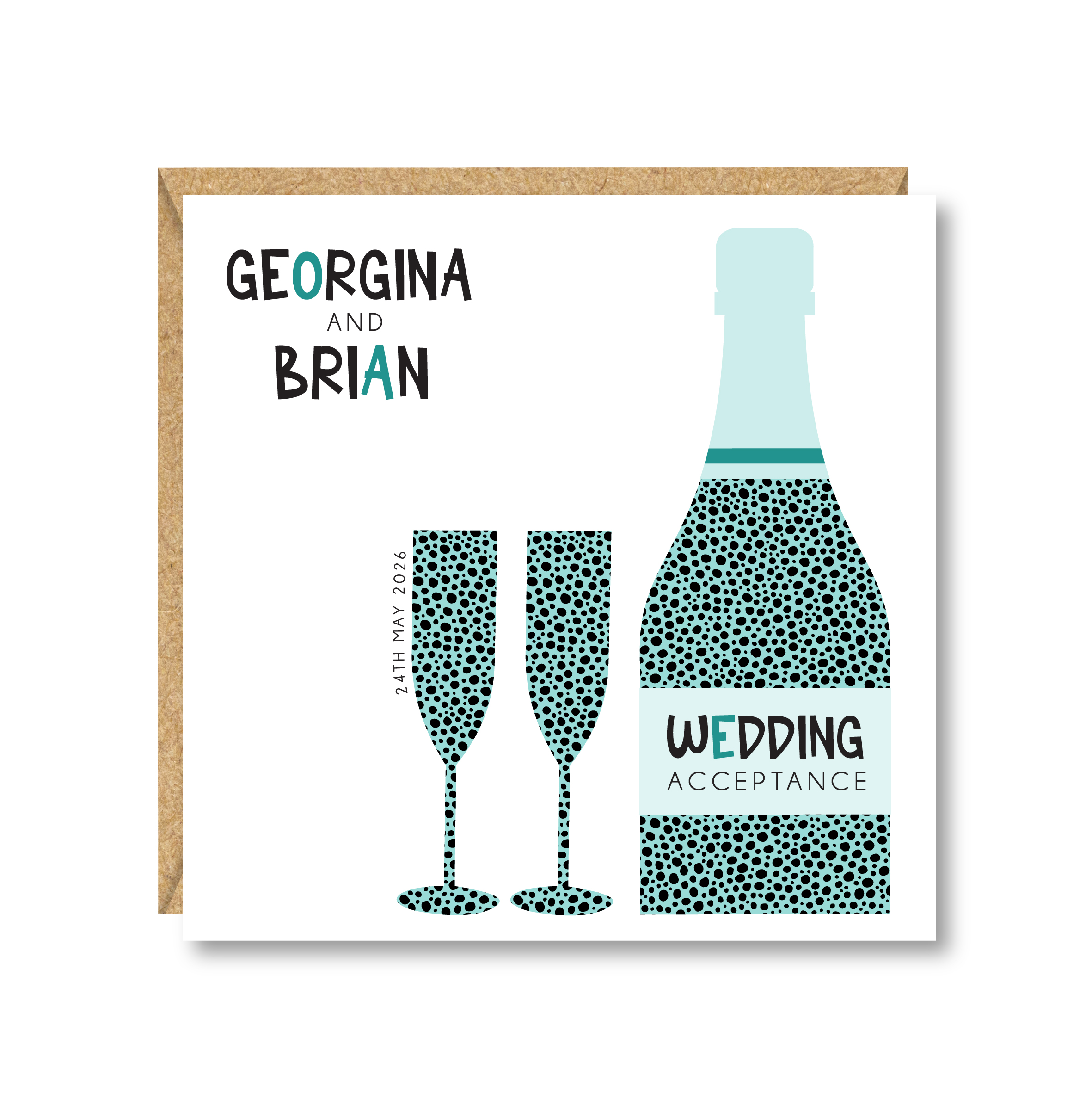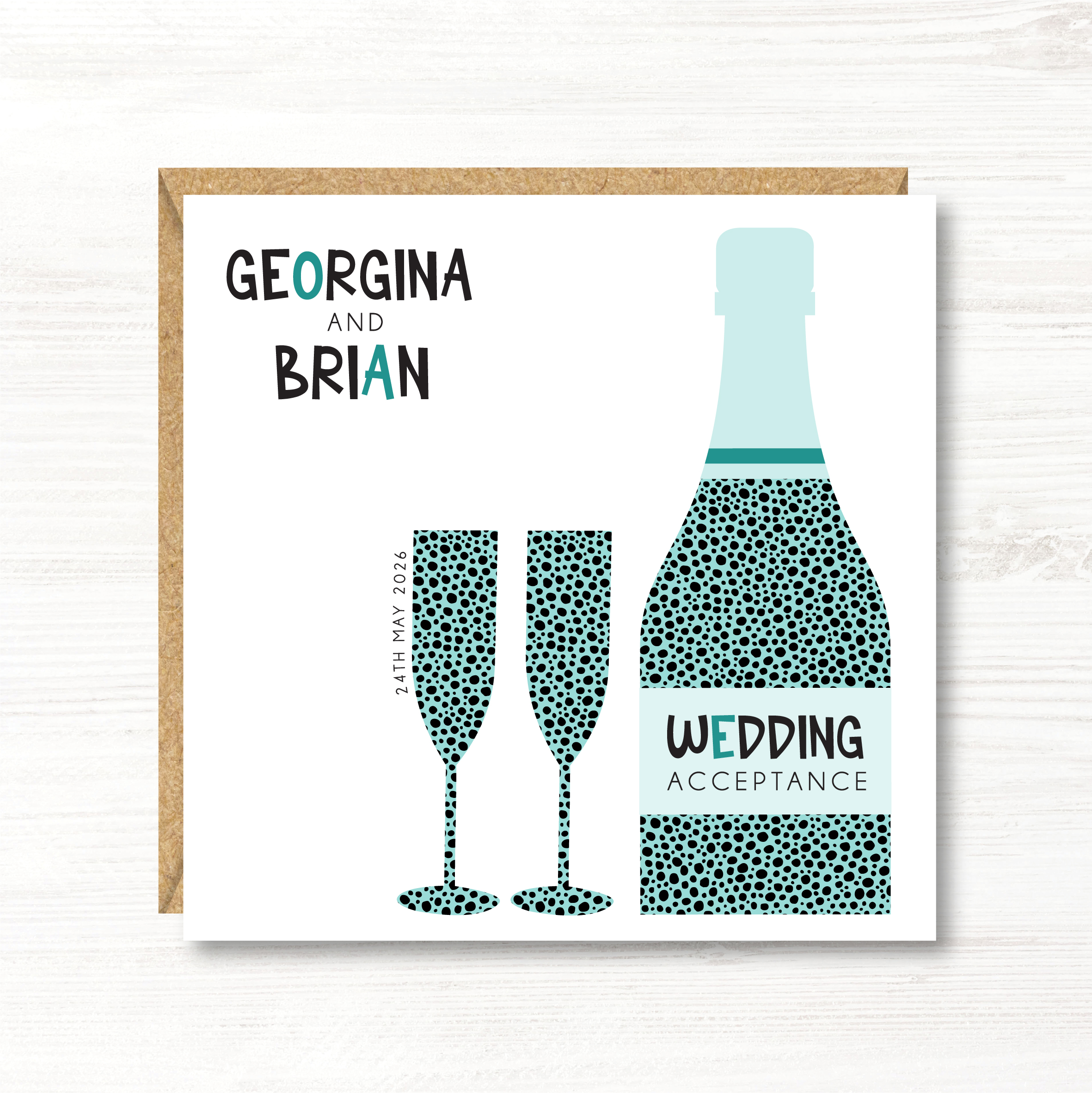 Beautiful champagne bottle and glasses in a black and green dot pattern.